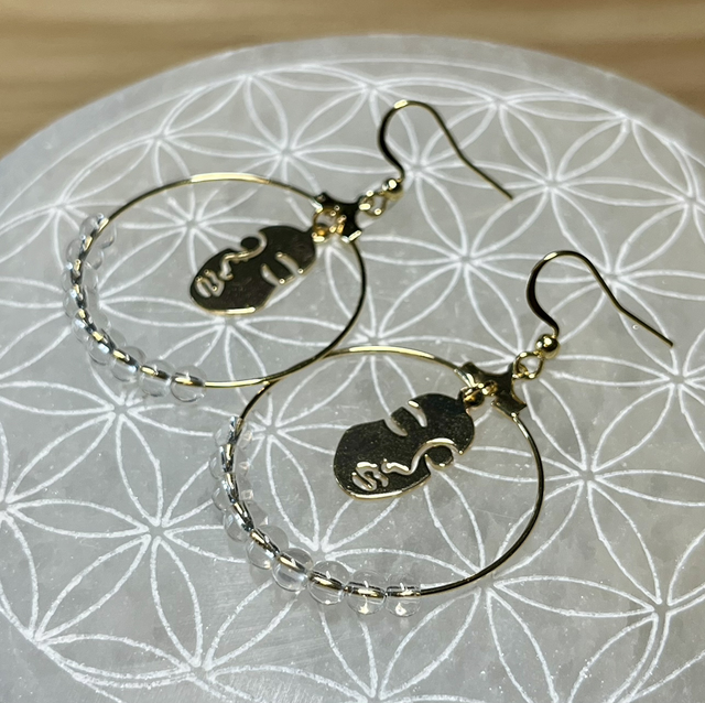 Une paire de boucles d’oreilles idéale pour un look sobre et élégant. Les anneaux et la breloque visage en plaqué or donnent toute la lumière dont un bijou a besoin.