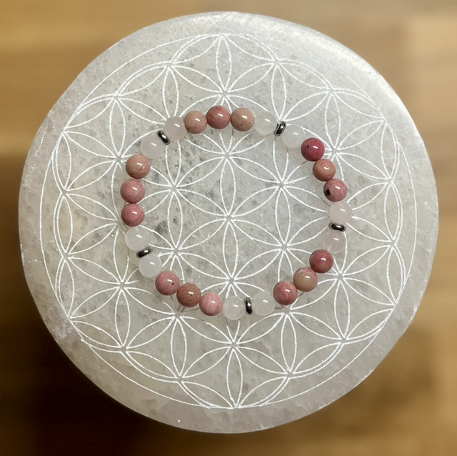 Vertus : La rhodonite et le quartz rose sont des pierres d’amour. Elles apaisent les angoisses et les blessures émotionnelles. Le quartz rose t’aide à prendre soin de toi !