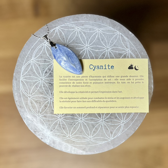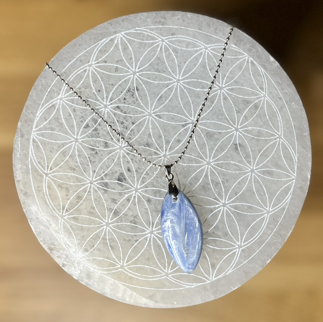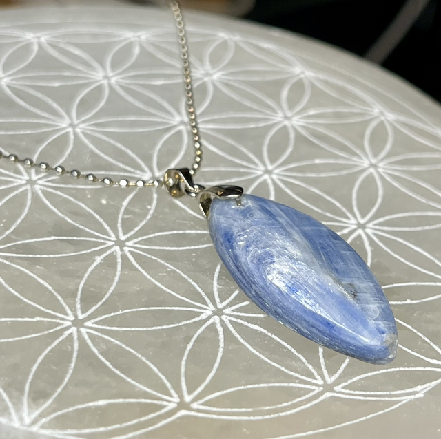 Une très belle cyanite montée sur une chaîne en argent. Elle a de magnifiques reflets !